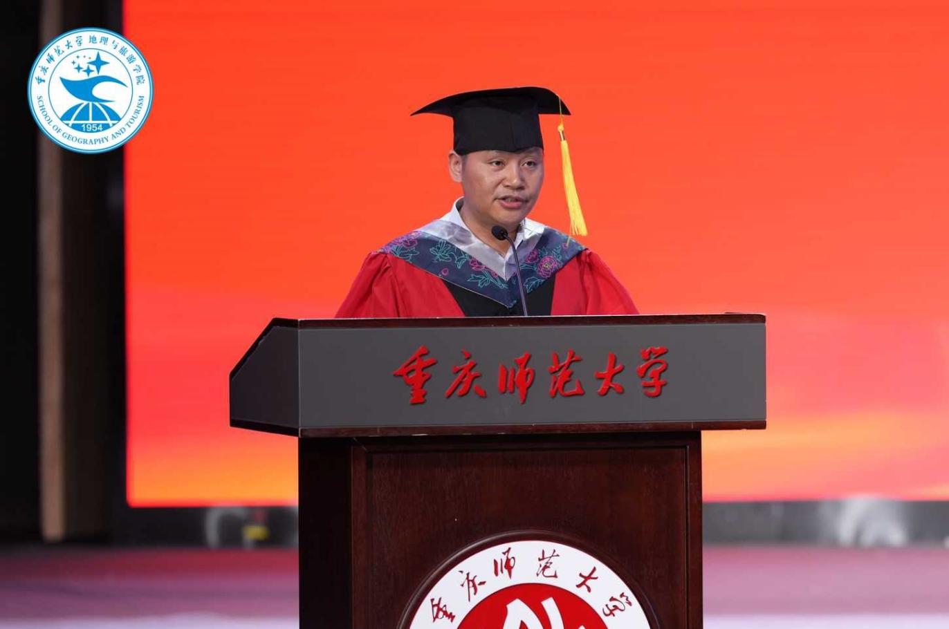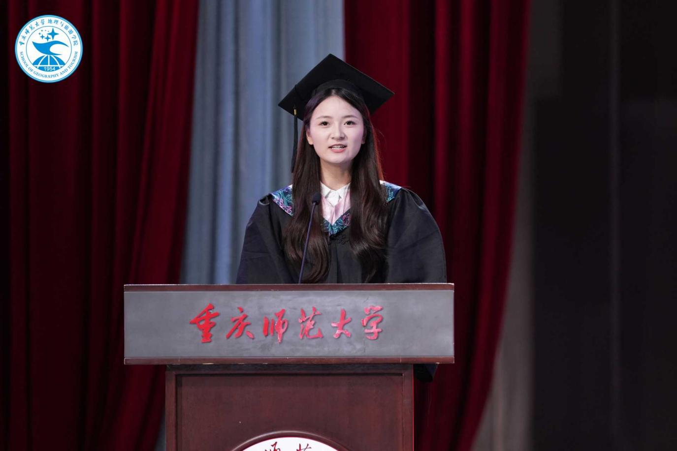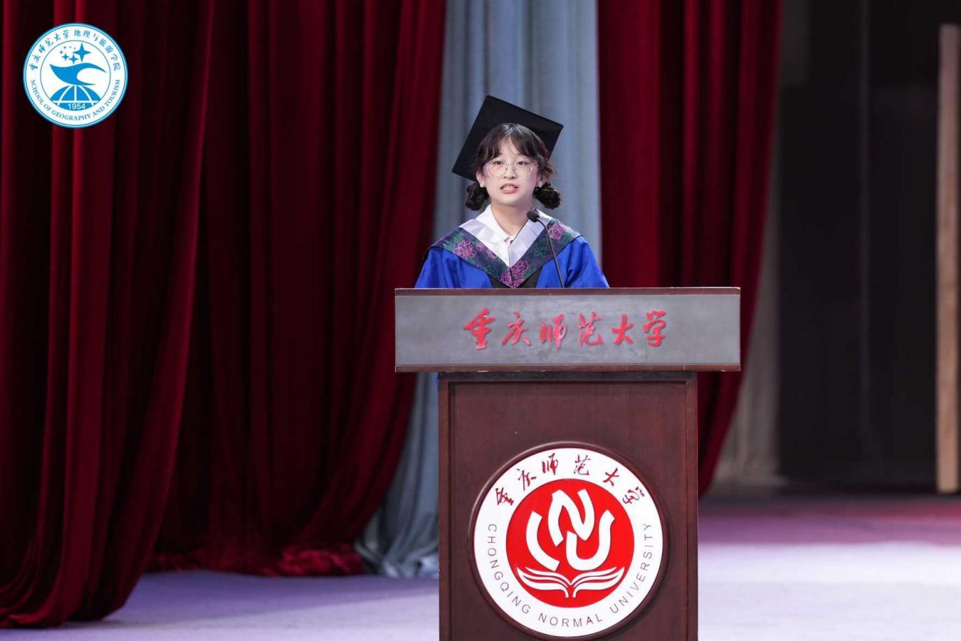 随后,2025届研究生毕业代表贾艺坤登台发言,分享了她三年来的学术成长经历。她从科研的迷茫阶段起步,最终成功发表了国际论文,并即将前往中国科学院继续深造,致力于以地理学专业为国家的发展贡献力量。她表示,未来将在更广阔的学术领域继续探索,并运用地理学的专业知识为国家的发展服务。同时,她鼓励在座的同学们,在人生旅途中不断磨砺自我,在中国式现代化建设的伟大征程中贡献地理学的智慧与力量,肩负起时代赋予的责任与使命,为实现中华民族的伟大复兴而努力奋斗。