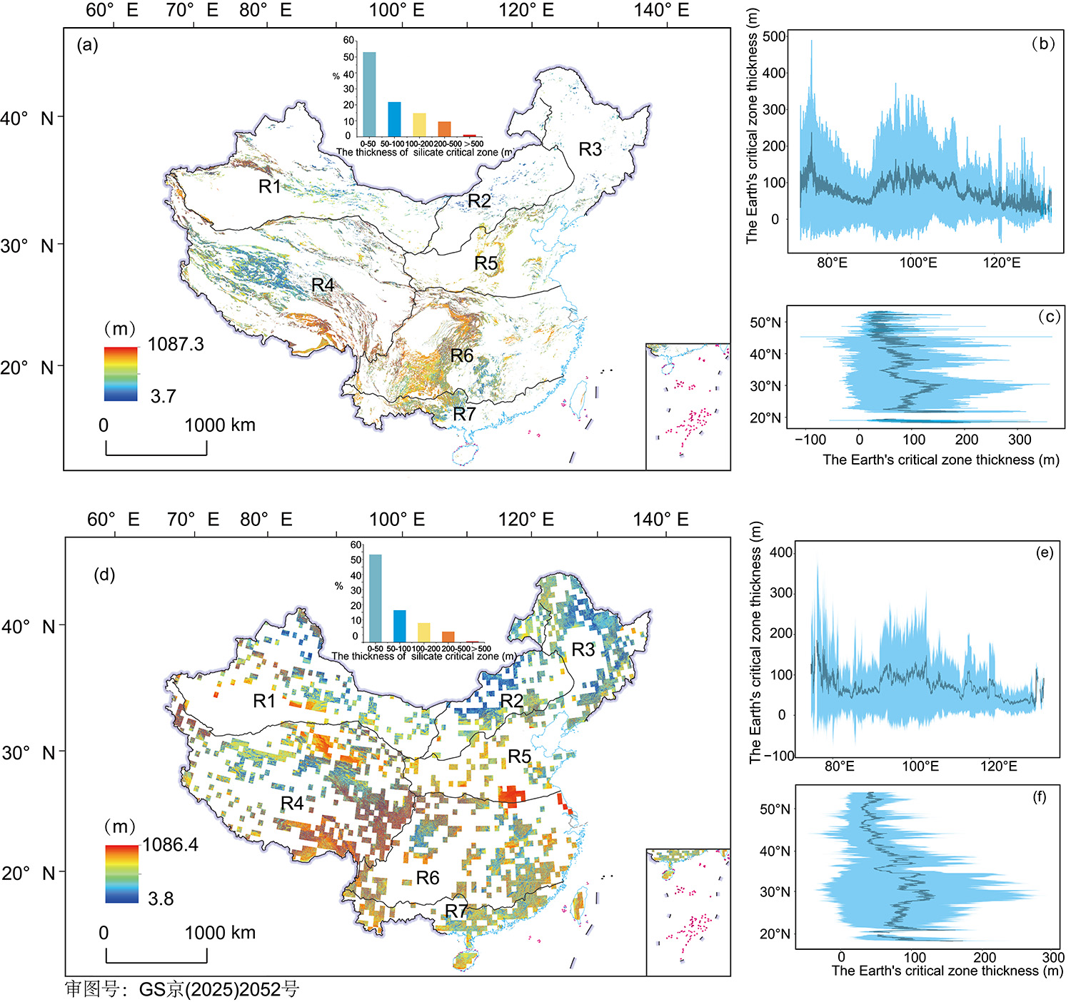 题目:中国碳酸盐岩(a)和硅酸盐岩(d)关键带厚度的空间分布;碳酸盐岩关键带厚度(b)和硅酸盐岩关键带厚度(e)随经度的变化;碳酸盐岩关键带厚度(c)和硅酸盐岩关键带厚度(f)随纬度的变化。 |