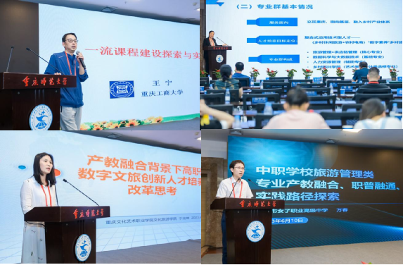 设立了“智慧旅游教育与人才培养”专题报告,分别由重庆工商大学教授王宁就旅游管理类一流本科课程建设与探索;重庆人文科技学院科研处赵静副处长围绕深化学科融合,强化数字实践;重庆文化艺术职业学院文化产业经营与管理专业负责人于兆坤就产教融合背景下高职数字文旅创新人才培养改革思考;重庆女子职业学校旅游部万春部长围绕中职学校旅游管理类专业产教融合、职普融通、科教融汇的实践路径探索进行了研讨。