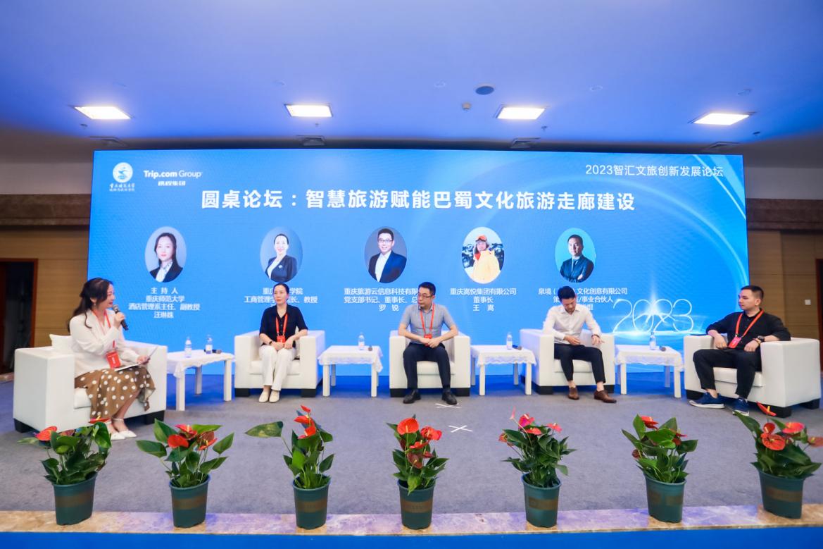 围绕智慧旅游赋能巴蜀文化旅游走廊建设开展了圆桌论坛环节,邀请到了重庆科技学院工商管理学院院长江燕玲教授,重庆旅游云信息科技有限公司党支部书记、董事长、总经理罗锐先生,重庆嵩悦集团有限公司董事长王嵩先生,泉境(重庆)文化创意有限公司策划总监/事业合伙人罗尚焜先生从教育、行业、企业、业态等多个视角通过智慧旅游手段赋能巴蜀文化旅游走廊建设进行了深入地讨论。