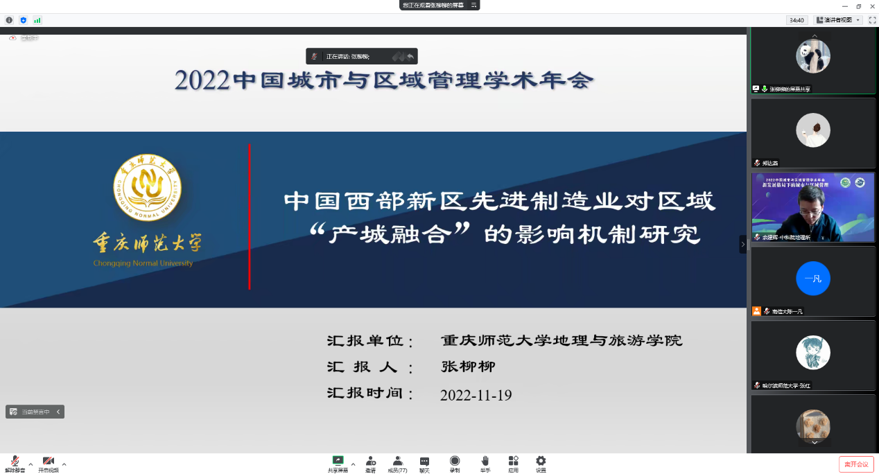 刘睿教授指导的硕士研究生张柳柳在“新发展格局下的城市与区域创新”分会场线上作了题为“中国西部新区先进制造业对区域‘产城融合’的影响机制研究”报告。报告以两江新区为例,定量、微观分析了先进制造业的空间布局特征、测度了区域“产城融合”水平,并深入研究了两者的空间关系和尺度效应,以期为区域高质量发展和公共设施合理配置提供科学参考。中国科学院地理科学与资源研究所余建辉副研究员对该报告进行了深入点评和肯定,并提出未来研究建议。