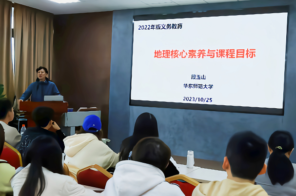 师生做题为《地理课程核心素养与课程目标》的学术报告。报告由学院党委书记胡芳主持。