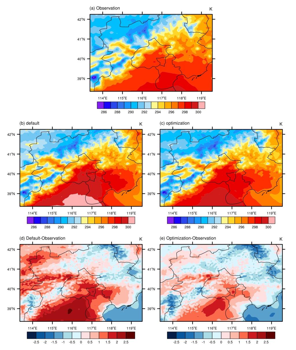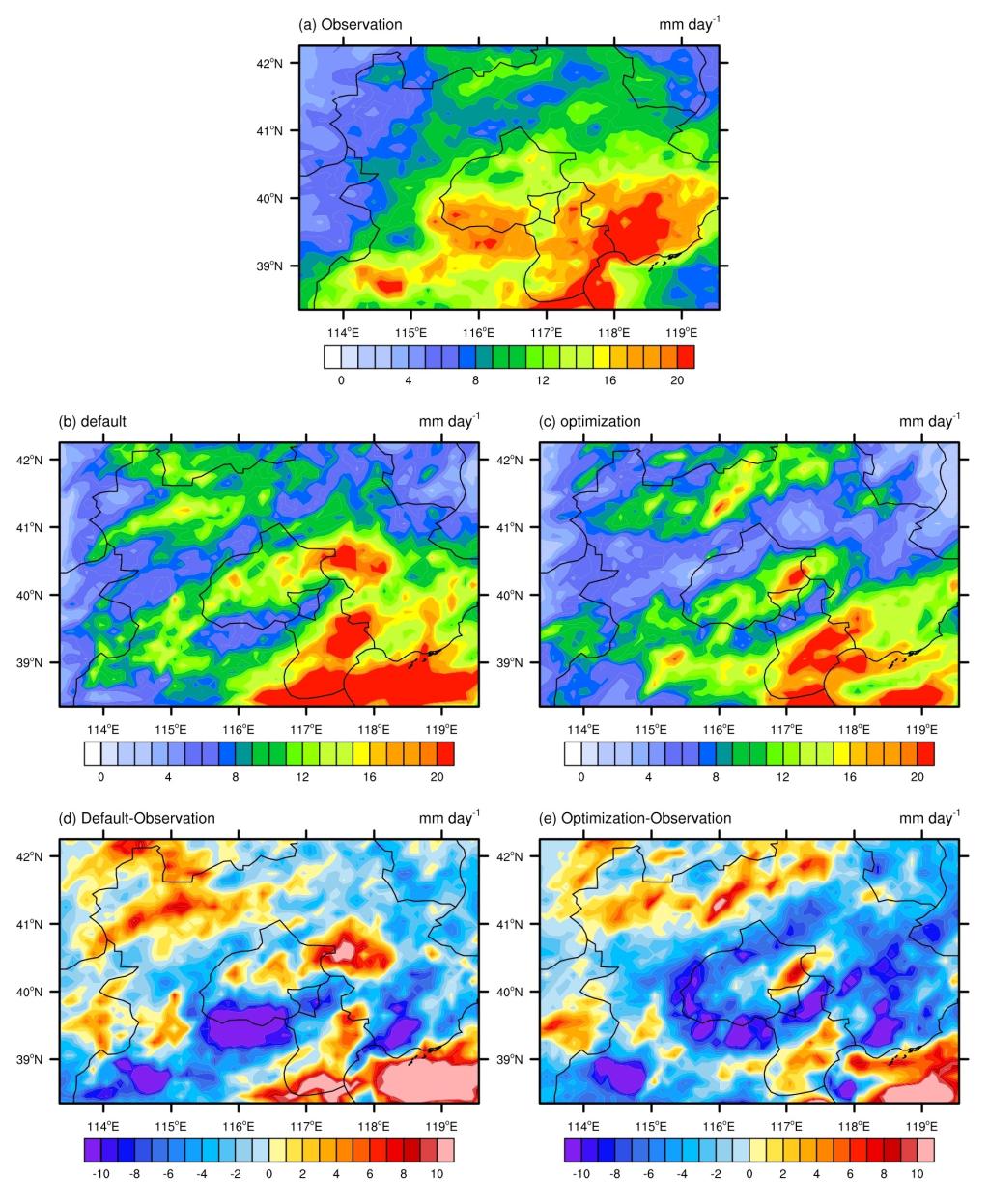 针对此难题,GIS应用创新研究团队的王恒博士与合作者们共同开发了一种名为“Knee point-based multiobjective optimization (KMO)”的多目标优化方法,并以大北京地区夏季降水和气温模拟为例进行了测试。通过在WRF模式中的应用,证实了该方法的经济有效性,仅需不到125个样本(即参数空间维数的25倍)就能够找到WRF模式的最优参数值。与默认参数相比,KMO确定的最优参数在所有时期(包括率定、验证和测试阶段)都表现出色,降低了降水模拟误差约9%以及气温模拟误差约16%。