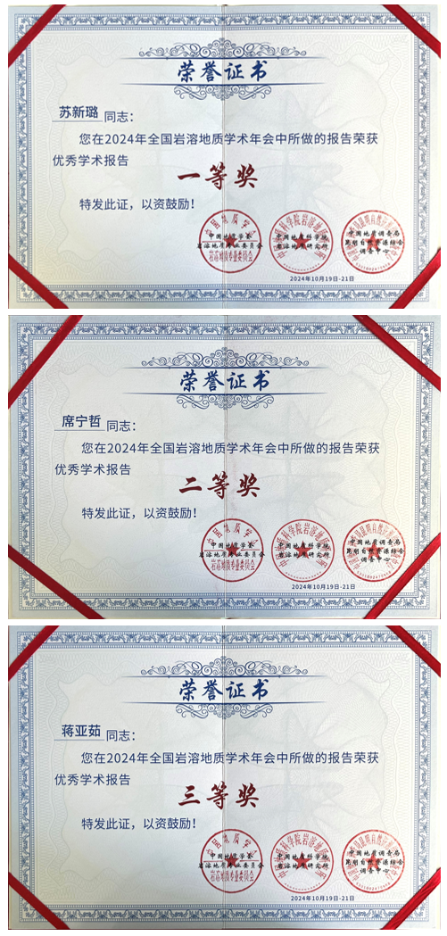 在2024年全国岩溶地质学术年会研究生论坛上,a片网站 研究生以卓越表现展示了深厚的学术功底和创新能力。其中,2023级研究生苏新璐获得一等奖、2022级研究生席宁哲获得二等奖,2023级研究生蒋亚茹获得三等奖。三位同学的杰出表现不仅展示了学院学科实力,也为学院争得了荣誉,充分体现了a片网站 在岩溶学领域的培养成果。