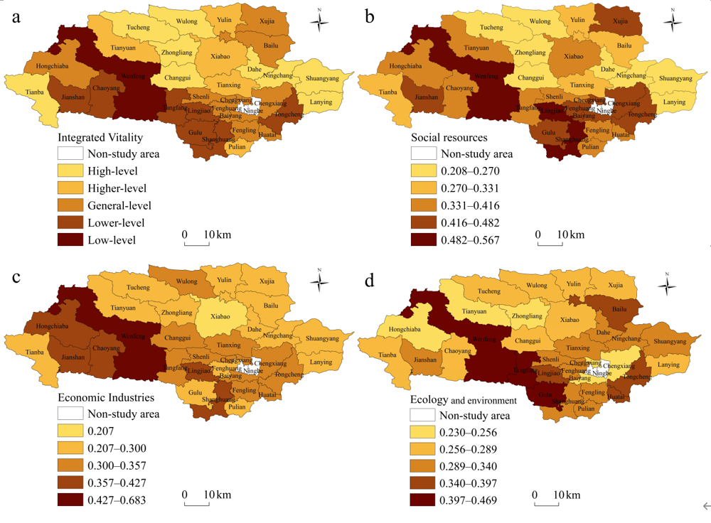 (图2活力计算值在(a)综合活力水平,(b)社会资源,(c)经济产业,(d)生态环境方面分布)