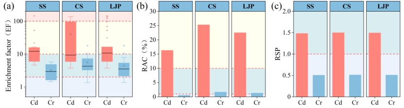 图2重金属富集特征(a)及其RAC(b)与RSP(c)指数风险评价