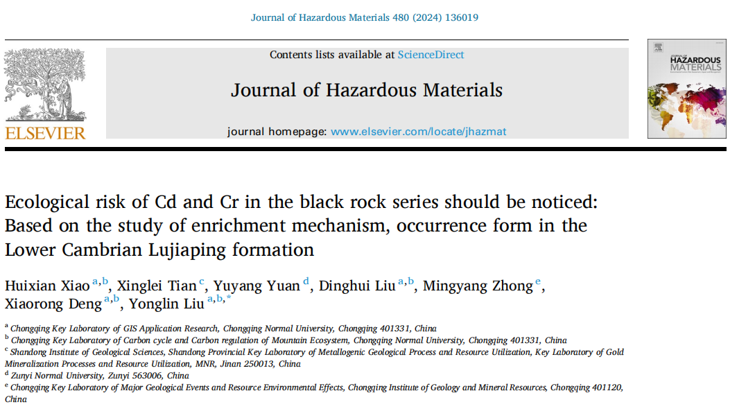 自然地理专业研究生肖慧娴以位于大巴山逆冲带的城口县北部下寒武统鲁家坪组(LJP)剖面出露黑色岩系为研究对象,采集30件岩石样品,硅质板岩(SS)、碳质板岩(CS)各15件,室内分析其常量和微量元素含量,逐级提取岩石Cd、Cr赋存形态,通过风险评估指数法(RAC)、次生相原生相比值法(RSP)对Cd、Cr进行生态风险评价,以揭示黑色岩系镉(Cd)、铬(Cr)的富集机制、赋存形态及其生态环境效应。研究成果以“Ecological Risk of Cd and Cr in the Black Rock Series should be noticed: Based on the study of Enrichment Mechanism, Occurrence Form in the Lower Cambrian Lujiaping Formation”为题发表在《Journal of Hazardous Materials》(中科院一区top,IF=12.2)上。GIS应用研究创新团队研究生肖慧娴为第一作者,刘永林老师为通讯作者。