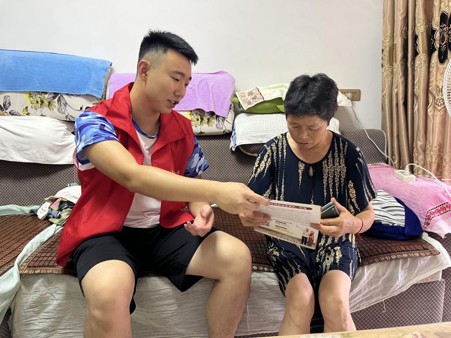 活动开展前,志愿者们有条不紊的分配工作、服装,认真听取社区工作人员的指导意见和经验教训并将其熟记于心。随后,他们顶着烈日开始走访。“这是我第一次进行社区走访,现在心情既紧张又激动,但我很开心能和这些老人交谈,有机会听到他们讲述子女、回忆过去,甚至是反映问题,为这些老人服务并实现价值能让我打心底里感到快乐!”走访志愿者傅于凡说到。实践团的志愿者们深入到每家每户,问候每位老人的身体状况生活状况,倾听他们谈论生活琐碎和经历过往,为老人们带去关爱。“感谢国家和社区,经常来关心我们,现在生活安逸哦”金秀青婆婆满心欢喜对志愿者们说。志愿者们用亲切的乡音、温暖的爱心和饱满的热情为一位位老人带去社区的关怀和青年的关心。
