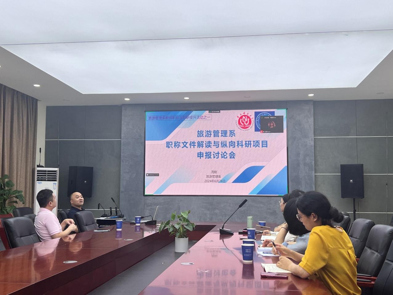 2024年6月28日下午,旅游管理系组织了第一次旅游管理系教师职称与科研提升活动:职称文件解读与纵向科研项目申报讨论会,旨在助力青年博士职业发展,提升青年教师队伍素质,推动纵向科研项目申报、促进旅游管理专业建设。旅游管理系王泽博士、张晨博士、董楠博士、刘昕怡博士、杨淑梅在读博士参与线下讨论交流,签约学校未报到的魏超博士线上参与了此次讨论会。讨论会由旅游管理系主任周刚副教授主持。