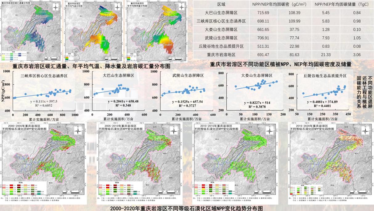 在耦联水生光合效应的碳酸盐风化碳汇学说指导下,发现岩溶区河流生态系统中碳酸盐缓冲效应与水生光合生物碳泵效应的协同作用对岩溶水体的CO2脱气过程及通量产生了抑制效应,进一证明了岩溶碳汇的稳定性;揭示了岩溶区水库在热分层期具有显著的直接吸收大气CO2形成明显碳汇效应和“闭锁” 水库内部CO2扩散、迁移的机制,新发现了岩溶区形成和稳定岩溶碳汇的新途径。率先在我国亚热带地表水体开展水气界面CO2气体交换关键参数(k600值)的野外实证研究,并建立了获取准确k600值的预测模型,为准确量化区域类似水体CO2脱气量提供了重要的计算模型。此外,较为系统的评价了重庆岩溶生态系统碳储量现状、碳汇能力及潜力。重庆岩溶区碳汇通量从大到小依次为武陵山生态屏障区、三峡库区核心区生态涵养区、大巴山生态屏障区、丘陵谷地生态品质提升区和大娄山生态屏障区,平均值分别为8.74 tC/km2/y、8.57 tC/km2/y、6.97tC/km2/y和6.88 tC /km2/y。重庆地区岩溶生态系统年均NPP范围为358.97-965.16 gC/m2,年固碳总量为21.33 TgC。截止2020年,重庆岩溶区生态系统地上碳储量为709.28 TgC。