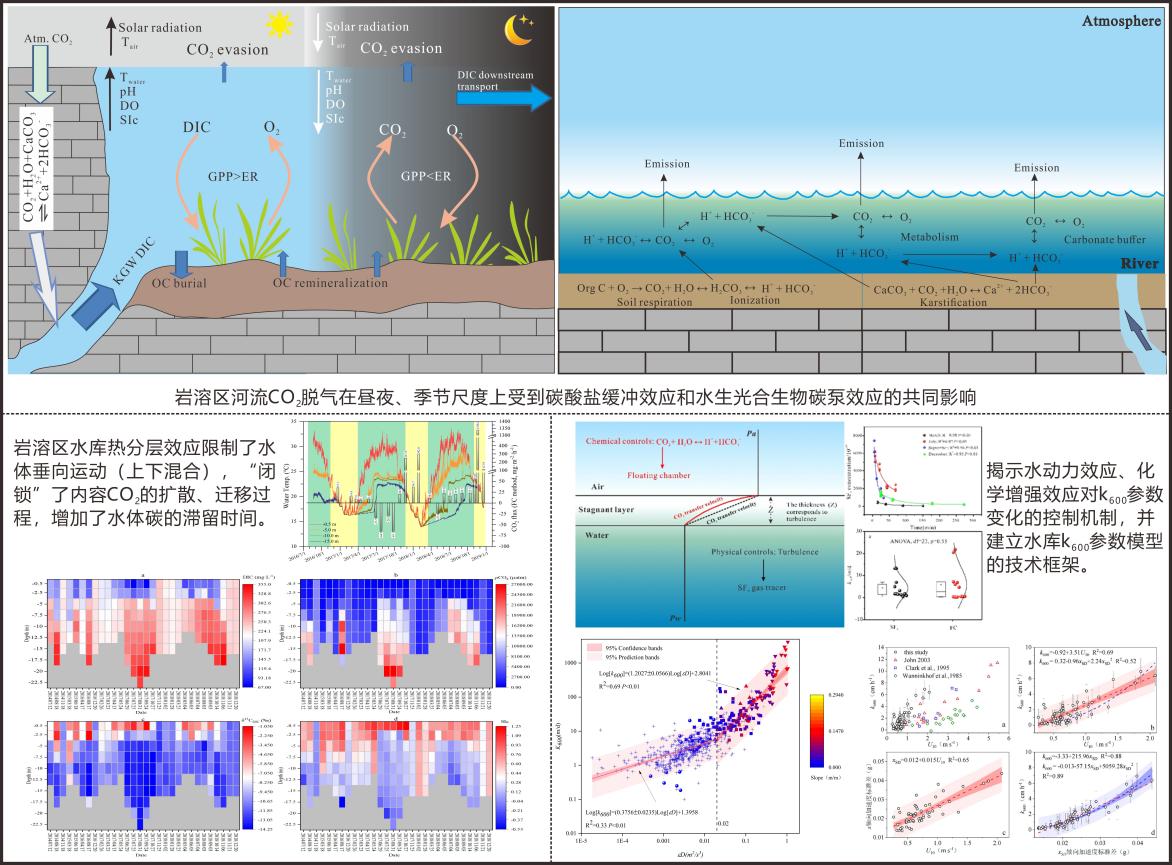 在耦联水生光合效应的碳酸盐风化碳汇学说指导下,发现岩溶区河流生态系统中碳酸盐缓冲效应与水生光合生物碳泵效应的协同作用对岩溶水体的CO2脱气过程及通量产生了抑制效应,进一证明了岩溶碳汇的稳定性;揭示了岩溶区水库在热分层期具有显著的直接吸收大气CO2形成明显碳汇效应和“闭锁” 水库内部CO2扩散、迁移的机制,新发现了岩溶区形成和稳定岩溶碳汇的新途径。率先在我国亚热带地表水体开展水气界面CO2气体交换关键参数(k600值)的野外实证研究,并建立了获取准确k600值的预测模型,为准确量化区域类似水体CO2脱气量提供了重要的计算模型。此外,较为系统的评价了重庆岩溶生态系统碳储量现状、碳汇能力及潜力。重庆岩溶区碳汇通量从大到小依次为武陵山生态屏障区、三峡库区核心区生态涵养区、大巴山生态屏障区、丘陵谷地生态品质提升区和大娄山生态屏障区,平均值分别为8.74 tC/km2/y、8.57 tC/km2/y、6.97tC/km2/y和6.88 tC /km2/y。重庆地区岩溶生态系统年均NPP范围为358.97-965.16 gC/m2,年固碳总量为21.33 TgC。截止2020年,重庆岩溶区生态系统地上碳储量为709.28 TgC。